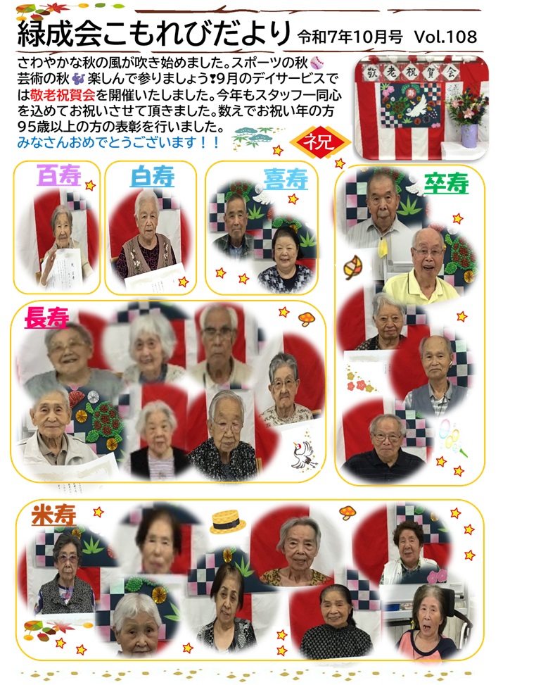 今年は、お祝い年の方や95歳以上の方が20名以上いらっしゃり、表彰を行いました。