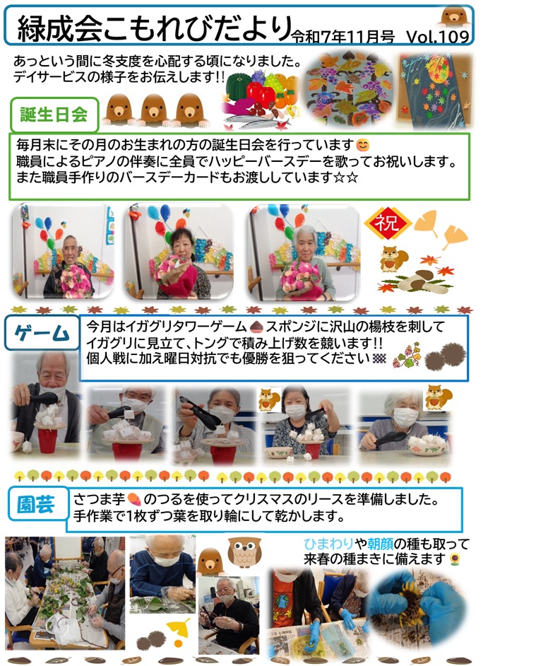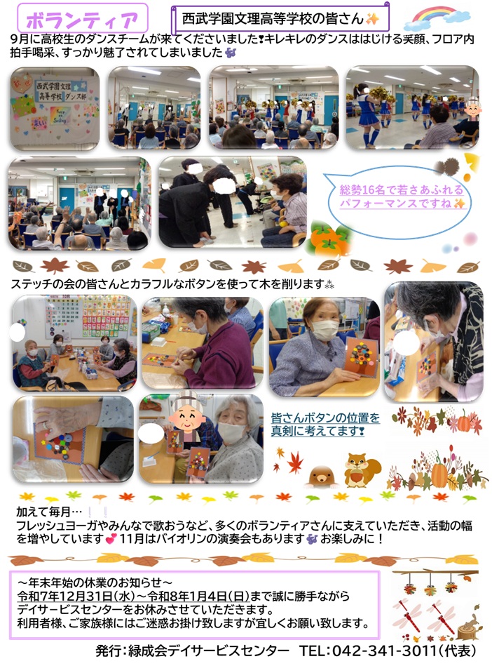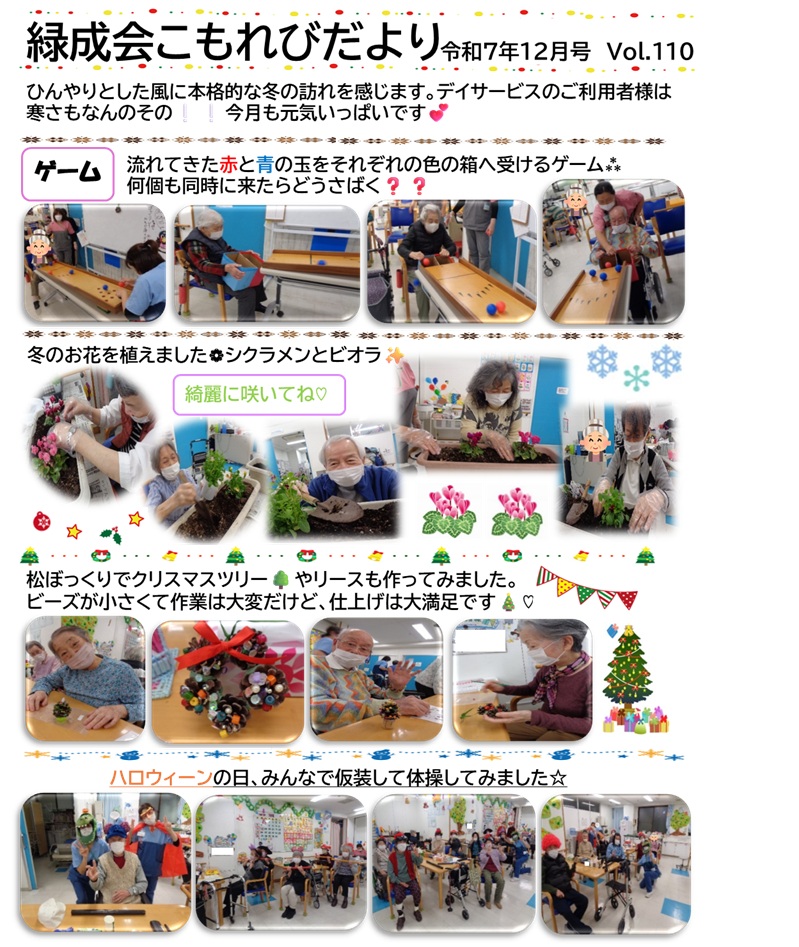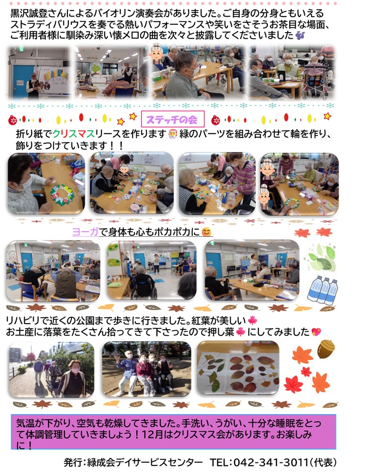 12月号は、暖かい日に屋外歩行訓練に出掛け、拾った落ち葉を、押し葉にしてみた様子や、バイオリン奏者のボランティアさんが来てくれた時の様子が載っています。