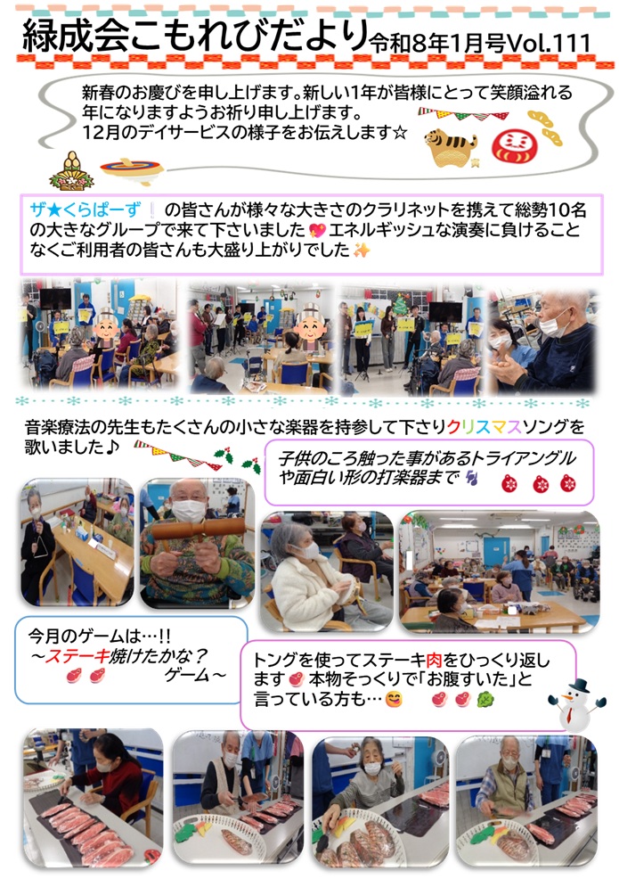 1月号は、クラリネットの演奏ボランティア「ザ・くらっぱーず」さんや、音楽療法の先生との楽器演奏、中学生の職場体験など、外部からの来訪者でにぎわいました。
